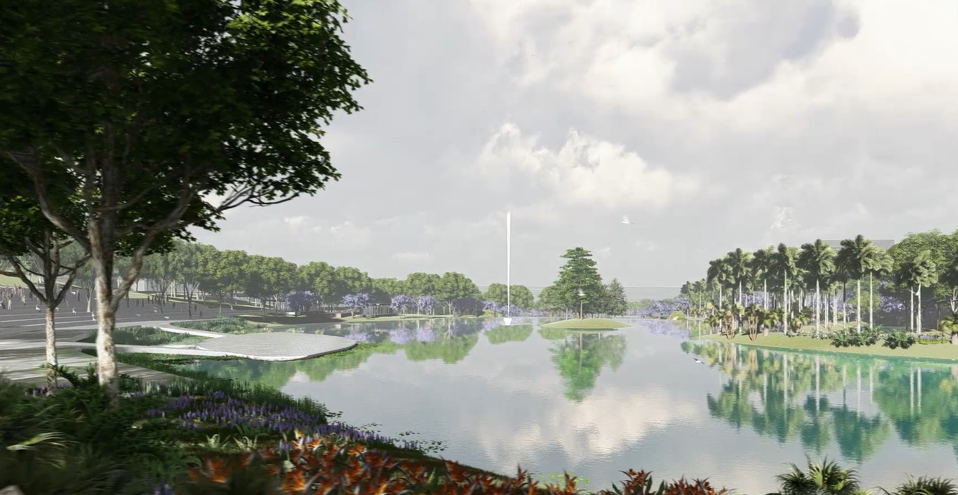 人工湖位于文化禮儀軸與濱水活力帶交匯處。位于湖中心的“奮發(fā)之泉 ”象征埃塞民族融合匯聚、奮發(fā)向上。保留現(xiàn)狀樹(shù)木,設(shè)計(jì)湖心島,豐富人工湖景觀層次。設(shè)計(jì)湖堤分隔人工湖與Bantyketu河,種植具有熱帶風(fēng)情的棕櫚樹(shù),形成美麗的“畫(huà)廊”。