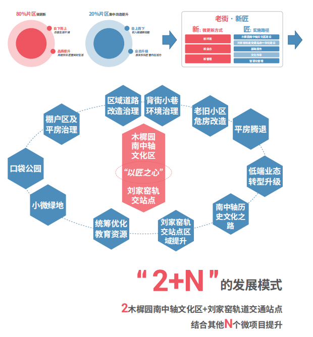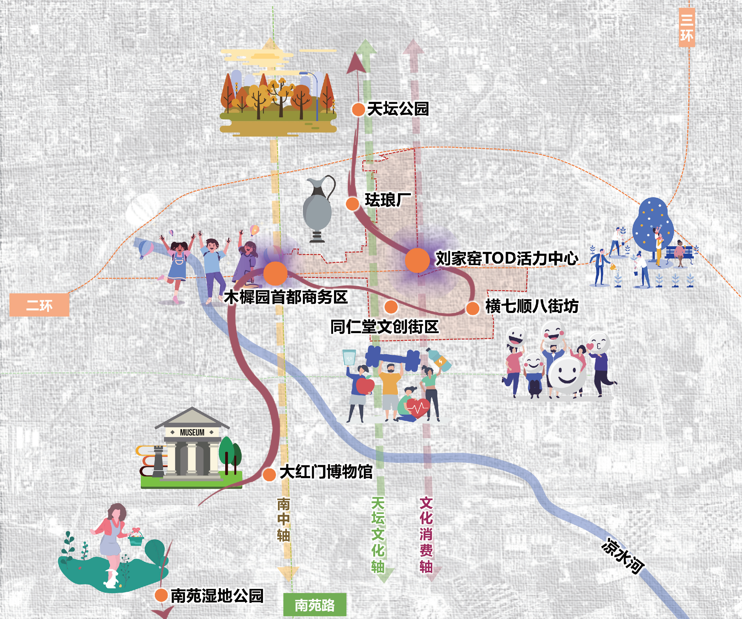 東鐵匠營街道位于北京南三環(huán)中部,區(qū)位優(yōu)勢(shì)明顯,歷史悠久,具有深厚的文化底蘊(yùn)。城市更新規(guī)劃范圍是東鐵匠營街道轄區(qū)3.1平方公里范圍內(nèi),常住人口10.1萬,下轄18個(gè)社區(qū)和1個(gè)村。規(guī)劃提出“老街新匠”的發(fā)展理念,定位圍繞居住功能服務(wù)的城南文化健康新中心,制定了城市更新微更新(80%)和集中改造(20%)相結(jié)合的發(fā)展策略,制定了街區(qū)層面“一帶五橋、兩點(diǎn)多片區(qū)”的空間結(jié)構(gòu),制定了“2+N”的發(fā)展模式,即:圍繞“微中心”建設(shè)以木樨園南中軸文化區(qū)和劉家窯軌道交通站點(diǎn)為重要抓手和著力點(diǎn)實(shí)施集中提升和改造,以“N”個(gè)微項(xiàng)目提升為抓手實(shí)施精細(xì)化改造,補(bǔ)齊民生和公共設(shè)施短板,提升地區(qū)人民生活質(zhì)量,發(fā)展蘊(yùn)含歷史文化氣息的新興商業(yè),打造城市更新、街區(qū)治理的鐵營模式。