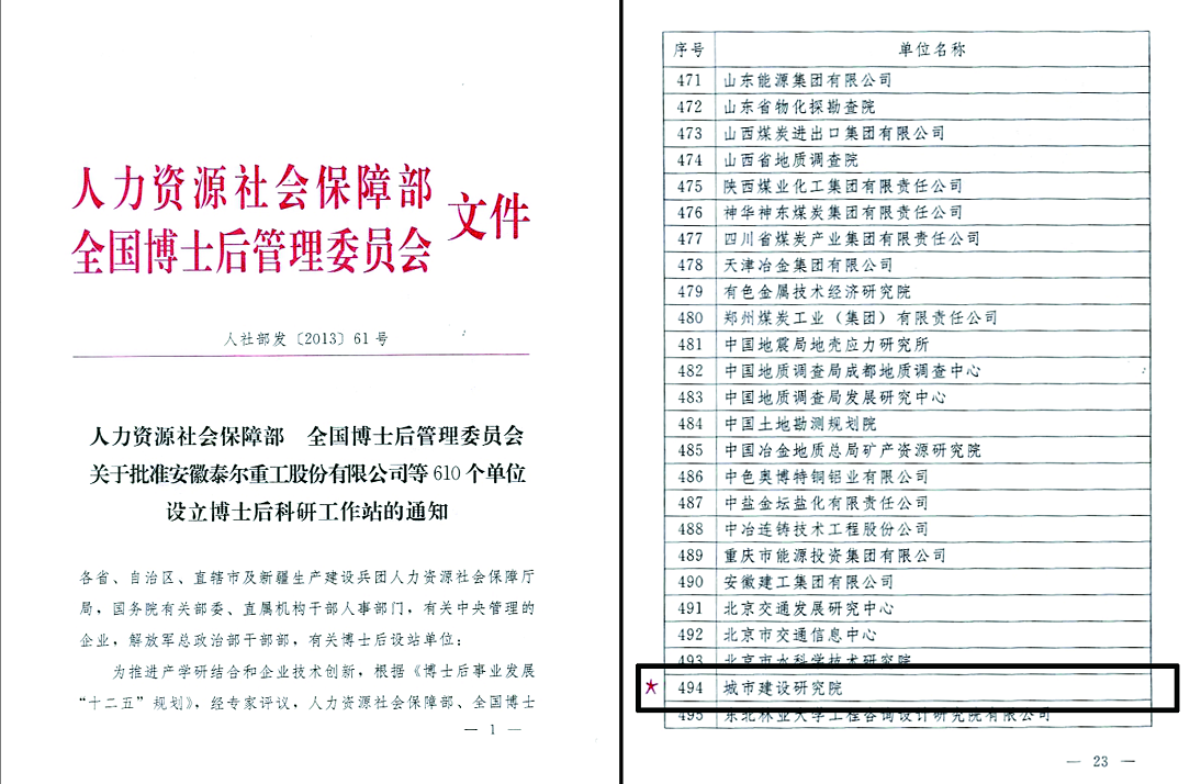 經(jīng)人力資源和社會保障部全國博士后管理委員會批準(人社部發(fā)[2013]61號),中國城建院博士后科研工作站于2013年8月成立,是較早一批建立的博士后工作站,并于2014年開始招收博士后研究人員。