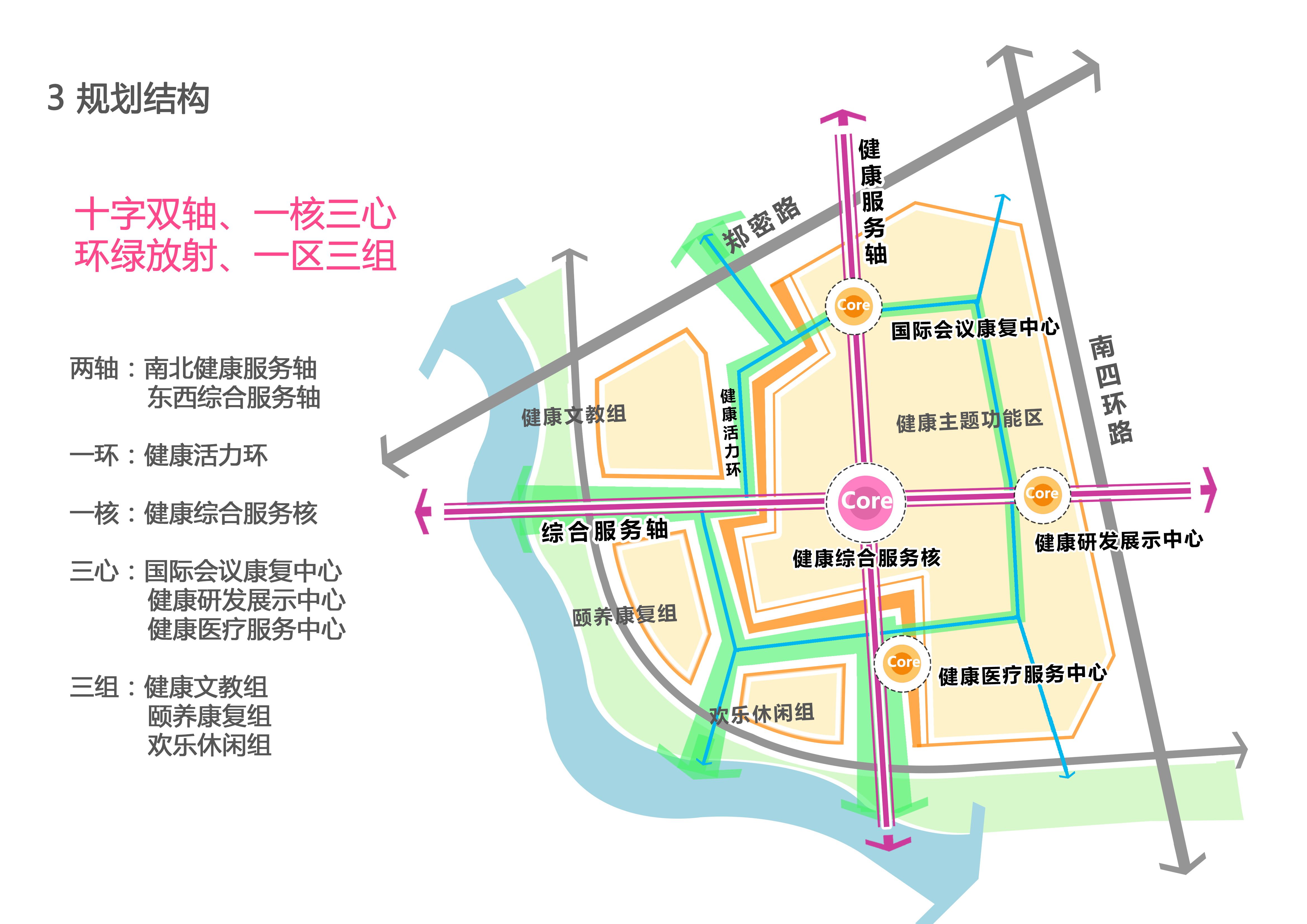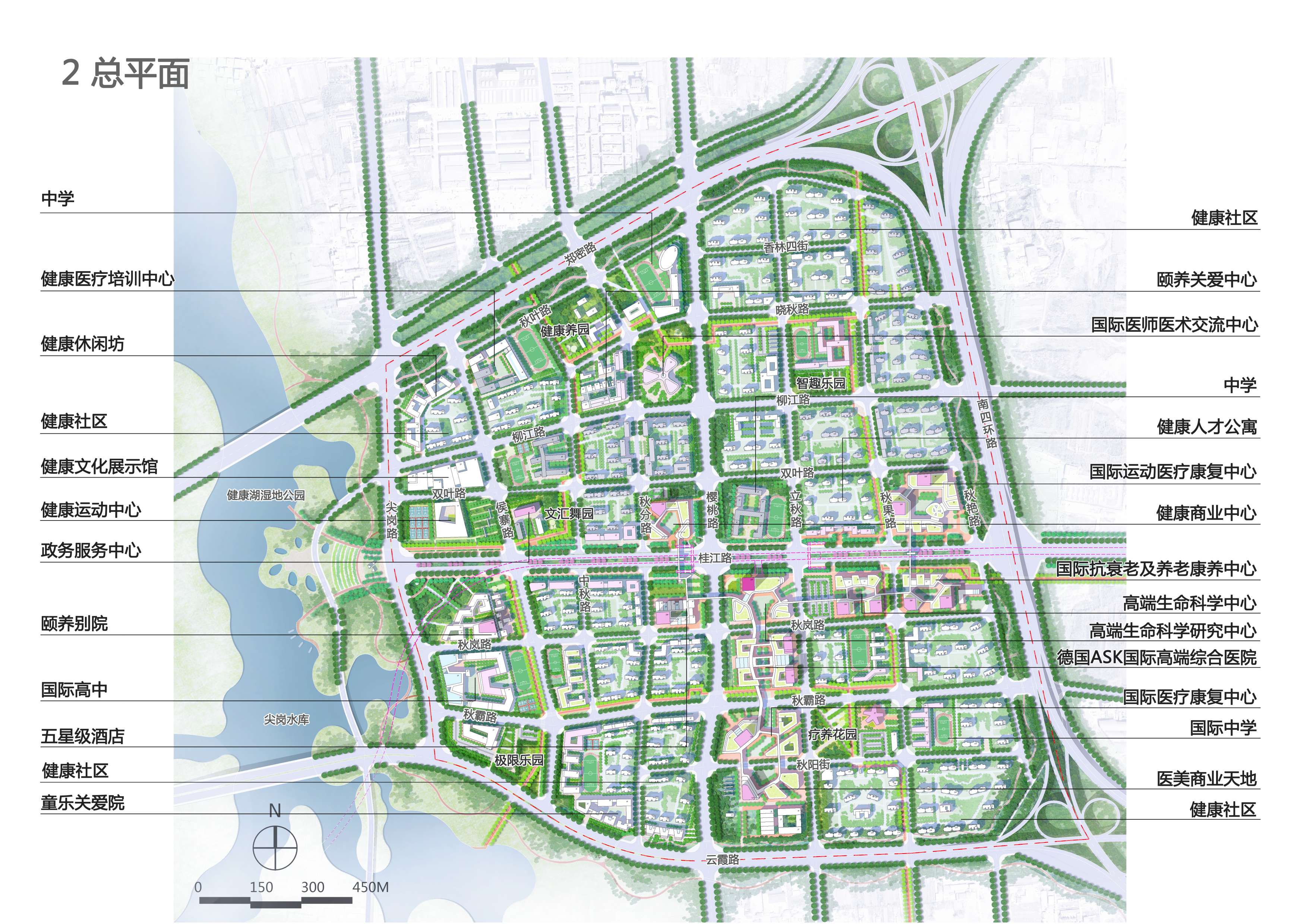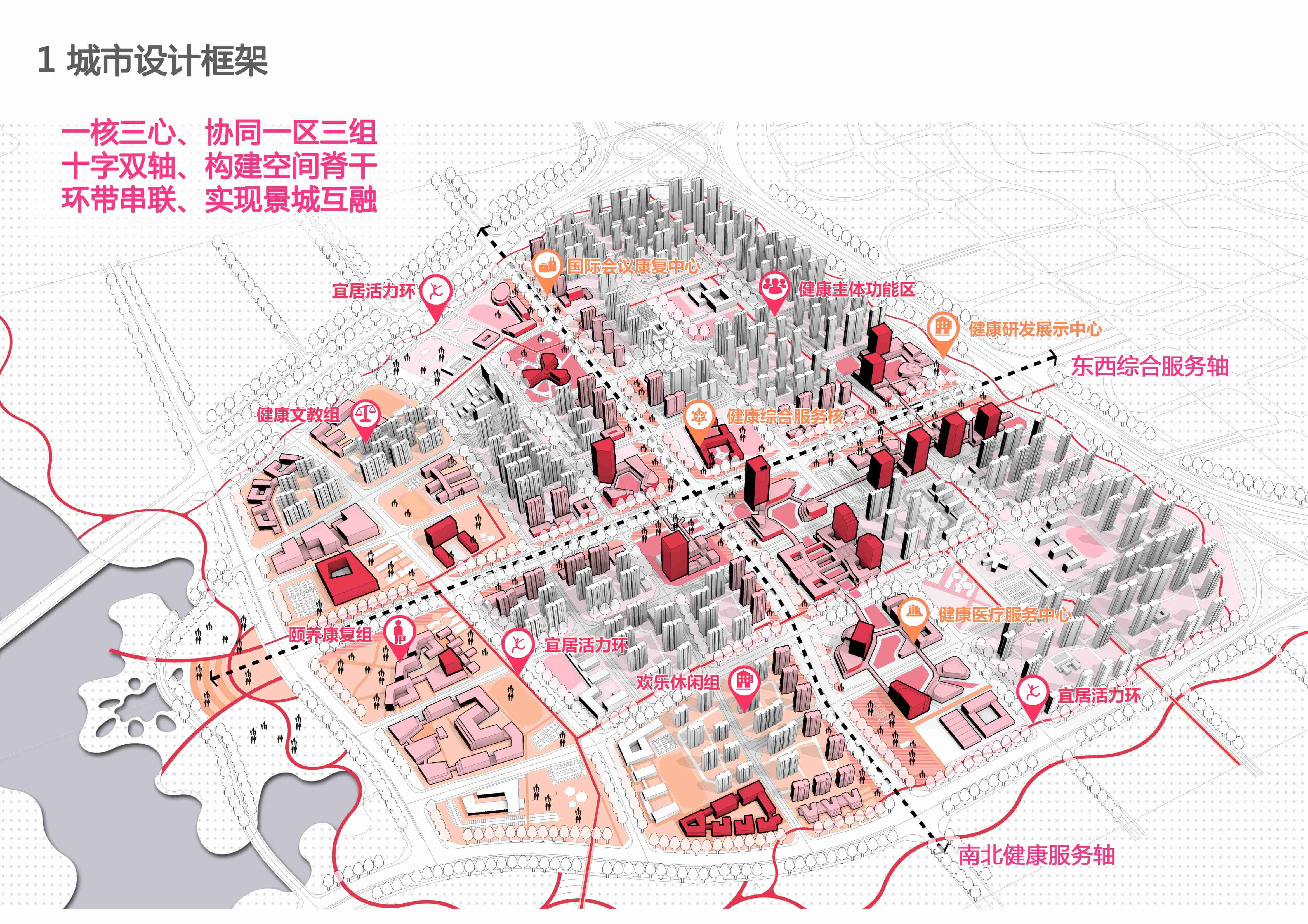 方案亮點(diǎn):①以產(chǎn)營(yíng)城,融合發(fā)展。以健康醫(yī)療、健康研發(fā)、健康服務(wù)3大主導(dǎo)產(chǎn)業(yè)與商業(yè)服務(wù)、居住地產(chǎn)、生態(tài)配套基礎(chǔ)產(chǎn)業(yè)構(gòu)建全域健康產(chǎn)業(yè)體系。②軸環(huán)定骨架,藍(lán)綠串產(chǎn)居。以東西、南北雙軸構(gòu)建基地空間發(fā)展軸,并形成主體功能區(qū)、健康文教組、頤養(yǎng)康復(fù)組、歡樂休閑組四個(gè)功能主題區(qū);通過內(nèi)部環(huán)狀綠帶及五個(gè)社區(qū)公園,融合社區(qū)服務(wù)、慢行活動(dòng)、海綿建設(shè)等功能,串聯(lián)各主題功能區(qū)及外圍水庫(kù)、防護(hù)綠地。②制定五網(wǎng)提升策略;對(duì)于對(duì)城市設(shè)計(jì)框架的落實(shí),城市設(shè)計(jì)提出功能網(wǎng),文化網(wǎng),交通網(wǎng)、生態(tài)網(wǎng)、智慧網(wǎng)五網(wǎng)提升策略。③構(gòu)建剛彈結(jié)合的管控體系?;趪?guó)際醫(yī)養(yǎng)健康城的空間意向和開發(fā)建設(shè)管控目標(biāo),構(gòu)建空間形態(tài)管控與規(guī)劃指標(biāo)管控兩大管控體系,前者側(cè)重于空間形態(tài)引導(dǎo),后者側(cè)重于建設(shè)指標(biāo)管控。