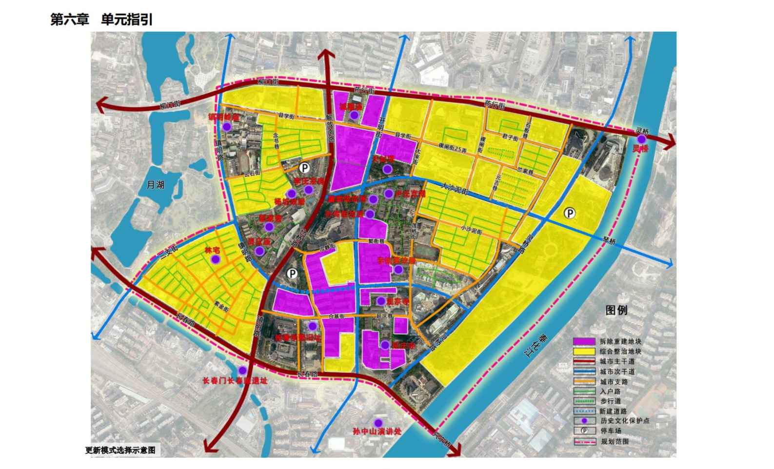 ③ 分類(lèi)引導(dǎo)。堅(jiān)持以人為本,圍繞更新單元內(nèi)部空間進(jìn)行適應(yīng)性更新。項(xiàng)目根據(jù)城市空間形態(tài)和功能,對(duì)更新單元進(jìn)行分類(lèi)引導(dǎo),按照需求將更新單元分為傳統(tǒng)文化商業(yè)區(qū)、歷史文化保護(hù)區(qū)、老舊小區(qū)、現(xiàn)代商業(yè)商務(wù)區(qū)、交通空間以及古城濱水休閑帶六個(gè)主要功能區(qū),分別對(duì)其進(jìn)行規(guī)劃指引。