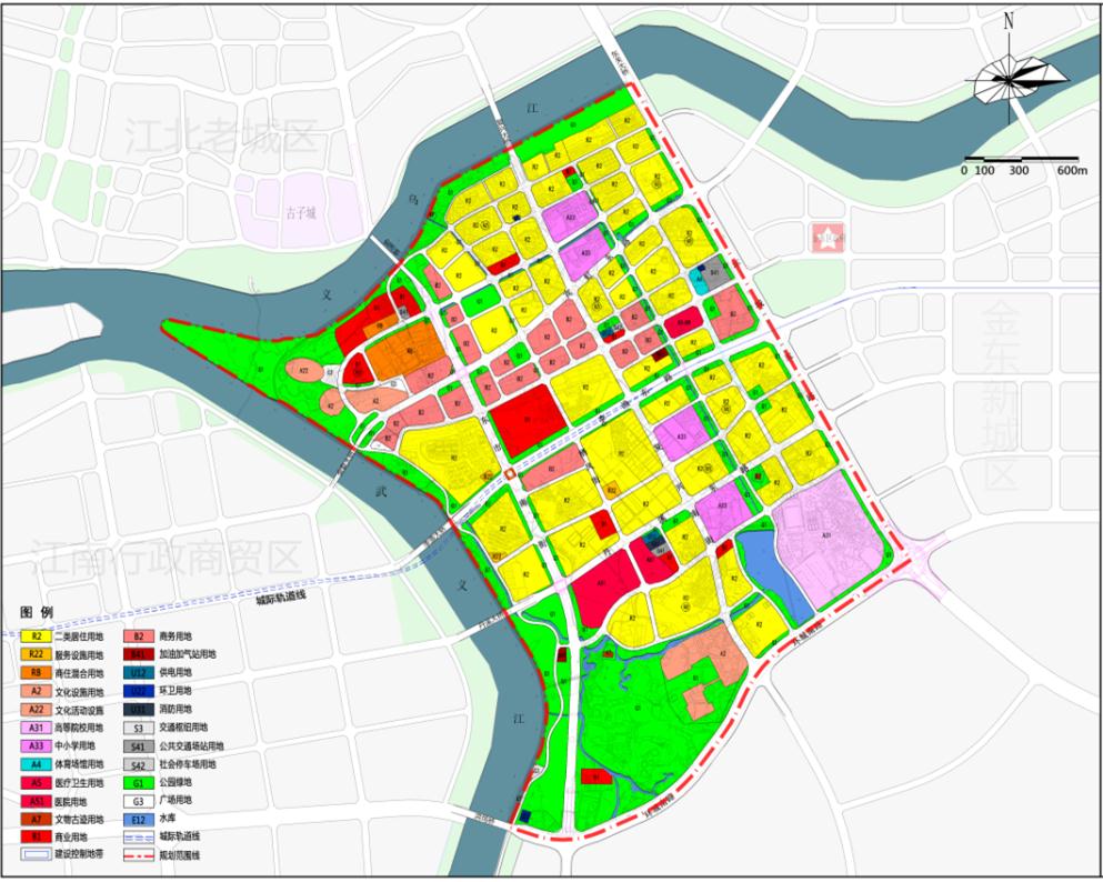 規(guī)劃形成“4+1”核心功能架構(gòu)。其中4為總部經(jīng)濟中心、經(jīng)濟中心、科技文化中心、教育培訓中心,1為生態(tài)游憩中心。北部核心商務區(qū)將成為復合型的城市中心,包括三大中心:浙中總部經(jīng)濟中心,地區(qū)金融服務中心,金華科技文化中心,東南部整合浙江交通技師學院的教育資源,集中發(fā)展教育培訓形成城市教育培訓中心;西南部赤山公園與江畔風水塘的山水資源,形成都市生態(tài)游憩中心。