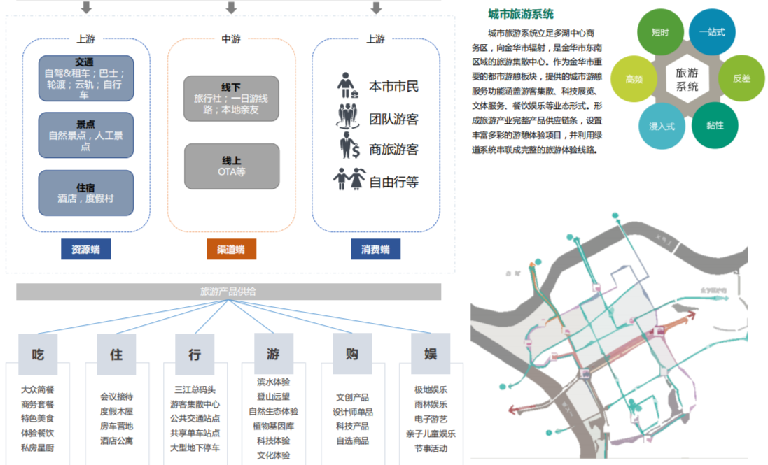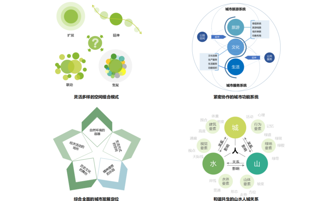 規(guī)劃以燕尾洲自然生態(tài)濕地、赤山公園生態(tài)山地的保護建設,以及巢塘湖水庫的改造為基礎,形成多湖地區(qū)以“濕地、山地、(人工)湖畔”三大主題為顯性特征的公園綠地體系。多湖地區(qū)水系豐富,規(guī)劃對現(xiàn)狀水系進行梳理的基礎上,規(guī)劃形成兩條濱水景觀綠帶。一條為以“C”字形帶狀公園為基礎,形成的一條多湖單元內(nèi)部以水為主題的濱水景觀綠帶,通過這條綠帶將中央金融、商業(yè)區(qū)、居住區(qū)、赤山公園和巢塘湖進行有機串聯(lián),形成不同的親水主題的景觀綠化帶。另一條為沿武義江、義烏江設置一定寬度的濱江景觀綠化帶,該綠帶串聯(lián)了燕尾洲生態(tài)濕地和赤山公園,為臨江文化和居住建筑營造出適宜的開放綠色空間。同時,規(guī)劃結(jié)合岸線一側(cè)的不同功能情況,營建不同風格主題的岸線景觀。