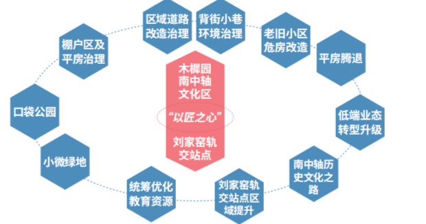 規(guī)劃提出“老街新匠”的發(fā)展理念,定位圍繞居住功能服務(wù)的城南文化健康新中心,制定了城市更新微更新(80%)和集中改造(20%)相結(jié)合的發(fā)展策略,制定了街區(qū)層面“一帶五橋、兩點(diǎn)多片區(qū)”的空間結(jié)構(gòu),制定了“2+N”的發(fā)展模式。